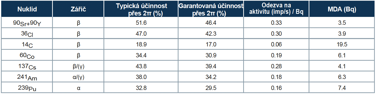 - Energetický rozsah: alfa >2.6 MeV, beta >30 keV, gama >5 keV